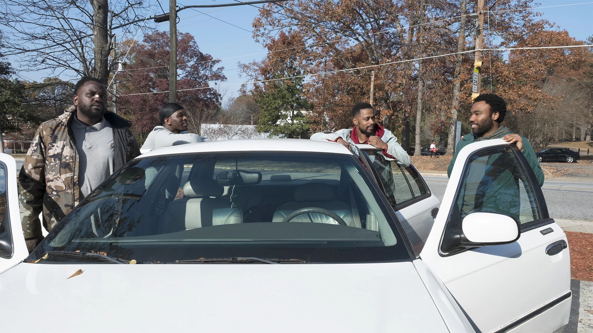 As they hide behind a tree from a campus security cart with a distressed white girl in the back, Al again wishes for weed and Darius smells some. They follow him to an all-white frat house, who are fans of Al and are more than happy to give him weed. The group notices a nude young man with a bag over his head being shoved into the house, and Prescott, the frat president explains that he is a pledge. The group is seated in front of a Confederate flag, two rows of pledges, all nude and bagged, kneeling before them. Tracy is the only one amused. Prescott tells Al he is tied for his favorite rapper with Post Malone, and Darius is taken with the frat's anitque gun collection. Darius and Tracy go with a member to see their gun room, while Prescott professes his love of snap music and has the pledges dance to D4L's "Laffy Taffy", only stopping when he sees Al is unamused. He leaves the two alone, and Al and Earn laugh before the former states "tonight was some bullshit" and tells Earn they need to discuss a problem. Earn assumes he is talking about Tracy, but Al states that he is talking about Earn and his blunders in preparing for the show. Earn insists that Tracy was the one at fault for throwing Violet down the stairs, but Al counters that Violet never would have been an issue if Earn had just gotten them a hotel. He tells Earn that he has been thinking of replacing him with Lucas, and that he has kept Earn with him because he is family, but he does not think Earn is fit to manage him.